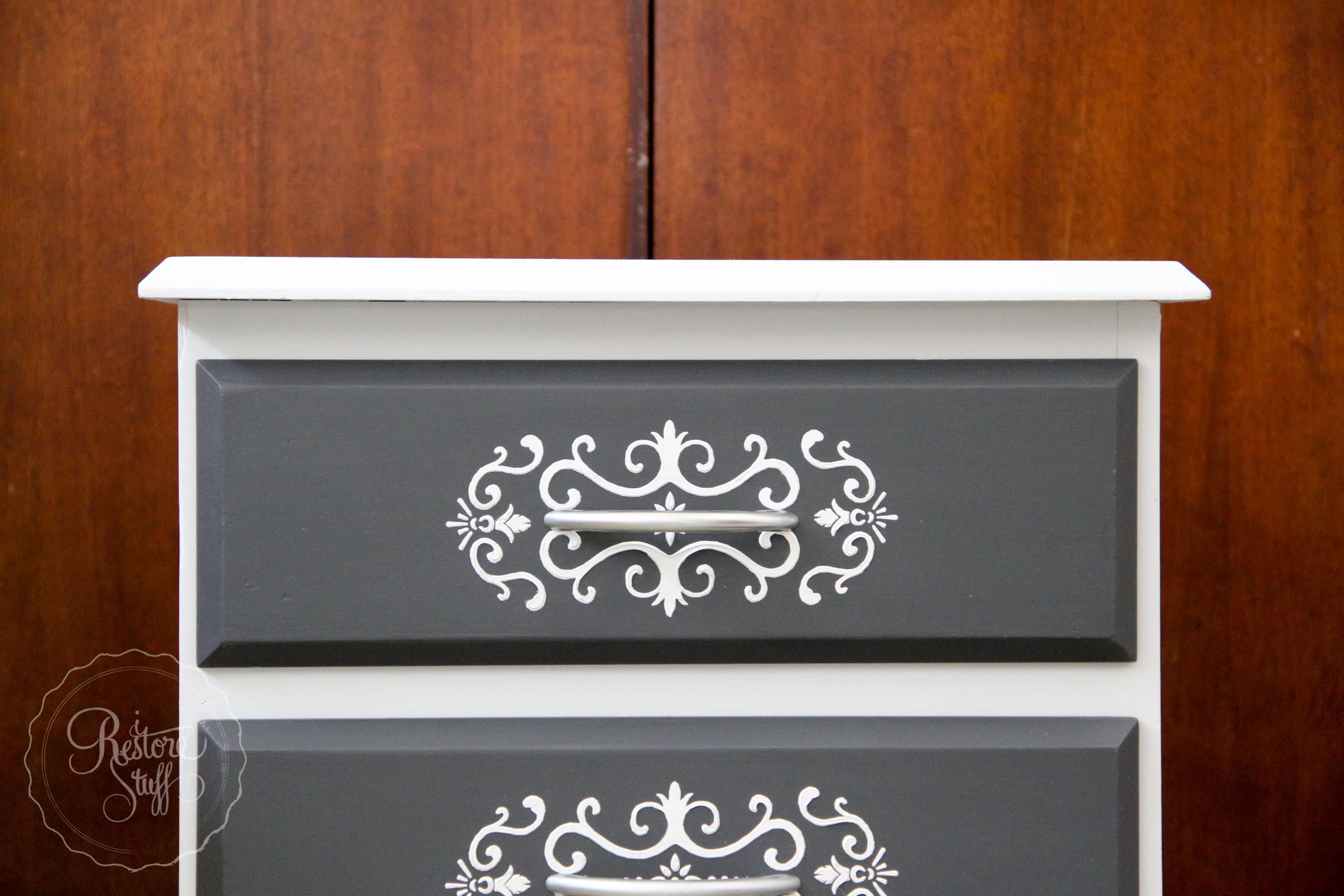 I used the Drawer One stencil BEFORE painting the drawers in MMSMPArabesque and detailing with White Wax.