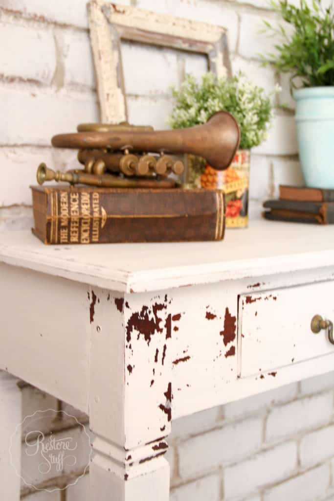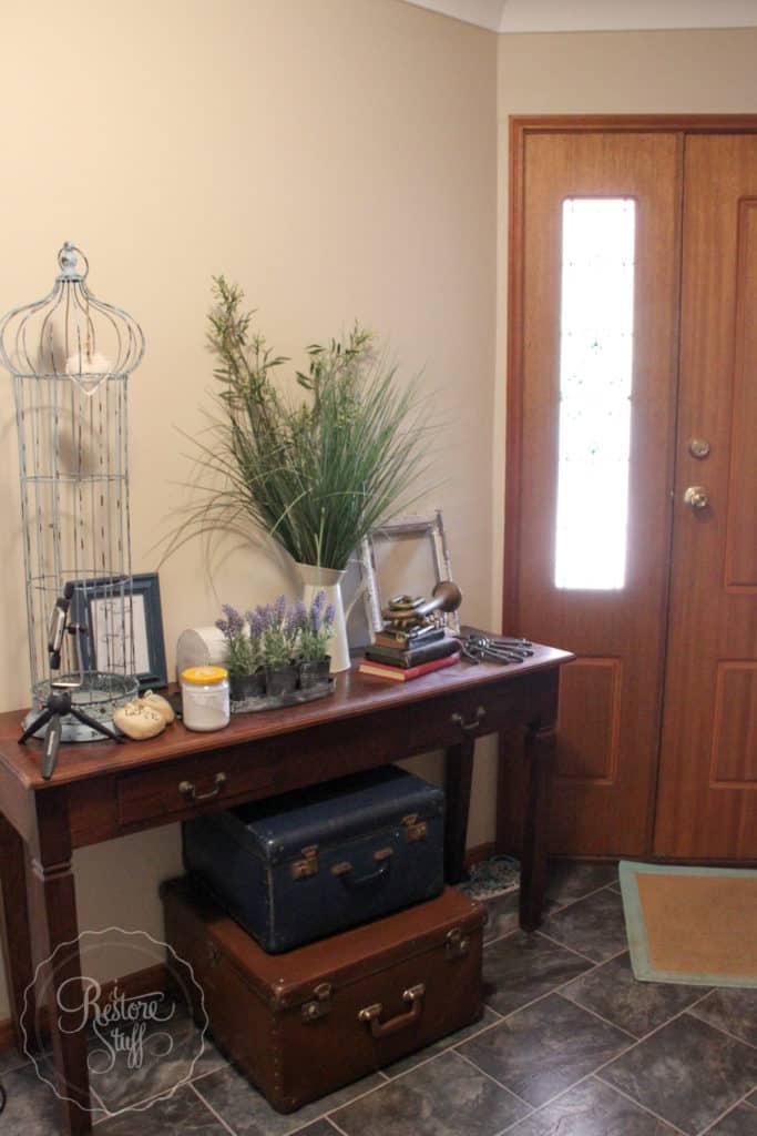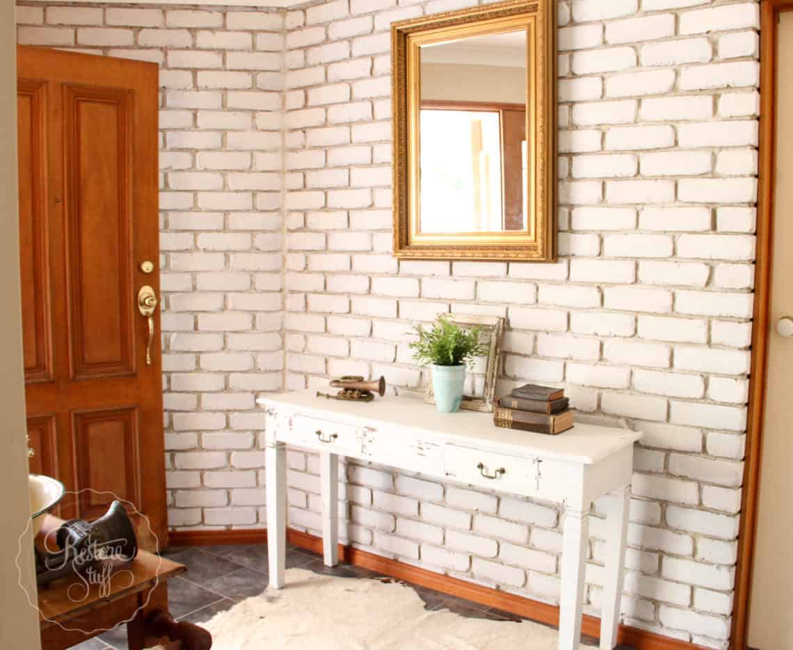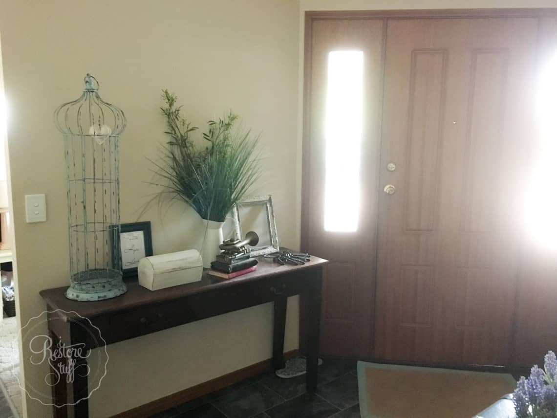 I love the white look, having left some of the Grainsack show through slightly in some parts, and the mortar left alone too.Painted brick wallAnd remember that hall table? It’s roughly sanded back here and ready for a Miss Mustard Seed’s Milk Paint makeover in Farmhouse White too.brick-wall-entry-mmsmp-0430I used two coats of Farmhouse White without any bonding agent, which resulted in a lovely amount of chippy goodness.brick-wall-entry-mmsmp-5722brick-wall-entry-mmsmp-5721Farmhouse White Milk PaintBrick Wall painted in Miss Mustard Seed's Milk PaintI’m so happy with the result of that wall. It really lightens up the whole entry way.Painted brick wall - Miss Mustard Seed's Milk PaintMilk Painted brick wallI feel like I’m still in the learning stages of staging. Ugh, I actually feel a bit hopeless about staging to be honest. After taking the above picture and starting to edit the photos, I felt the hall table was too cluttered, so I went back for a re-take and came up with a simpler look below … I’d love to hear your thoughts on staging.