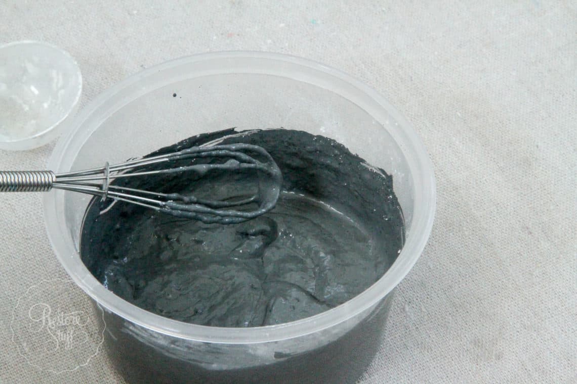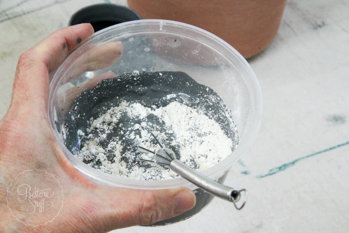 I mixed Fresco powder with Fusion Mineral Paint in the colour Ash in a ratio of 1 part Fresco to 2 parts paint and combined till it formed a lumpy paste (as above). We painted it all over the pot, stippling in areas, and allowing the lumpy portions to form texture all over the pot. Mixed with the Ash grey it looks a bit like wet concrete at this stage!