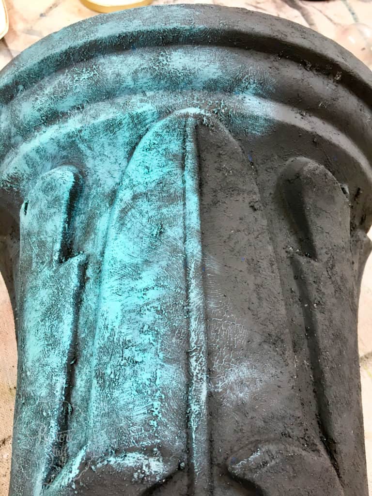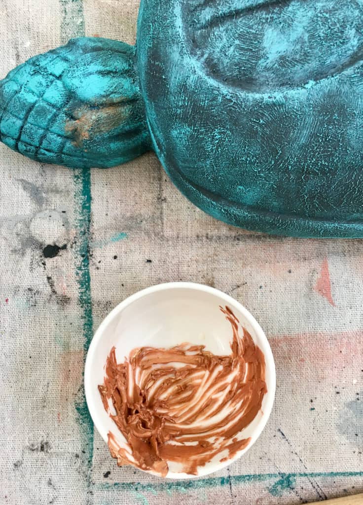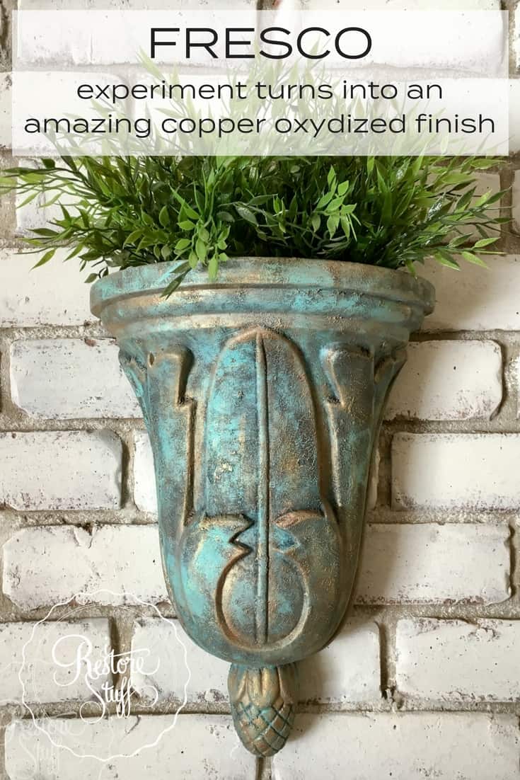 I was giving a fellow furniture painting friend a Fusion Fresco demo and asked her to bring something along for us to “play” with. What I didn’t know, was that we were about to discover a super easy way to create a faux oxydized copper look that blew us away with its awesomeness!