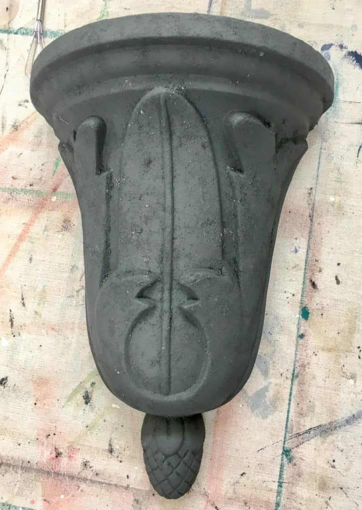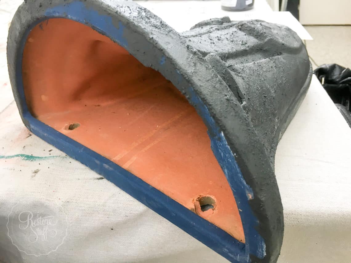 I forgot to take a “before” photo, but you can see the blue paint on this terracotta wall hanging planter on the ends here. That was the finish on this prior to adding a Fresco layer.