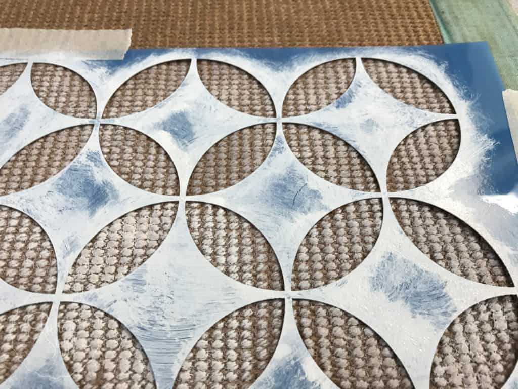 You can do this with any stencil of your choice. Just make sure you tape your edges down and if using a patterned stencil, line up your pattern well as you move your stencil around your rug.