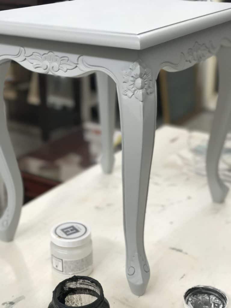I know someone is going to ask me quantities, but there really isn’t a hard and fast rule. Really, all you are doing is tinting the glaze with the paint colour. You’ll see me demonstrate this in the video further down in this post. For the large table, I probably used approximately 1/4 cup of Clear Glaze to do the entire table (maybe less), mixed with only a tablespoon of Ash colour.