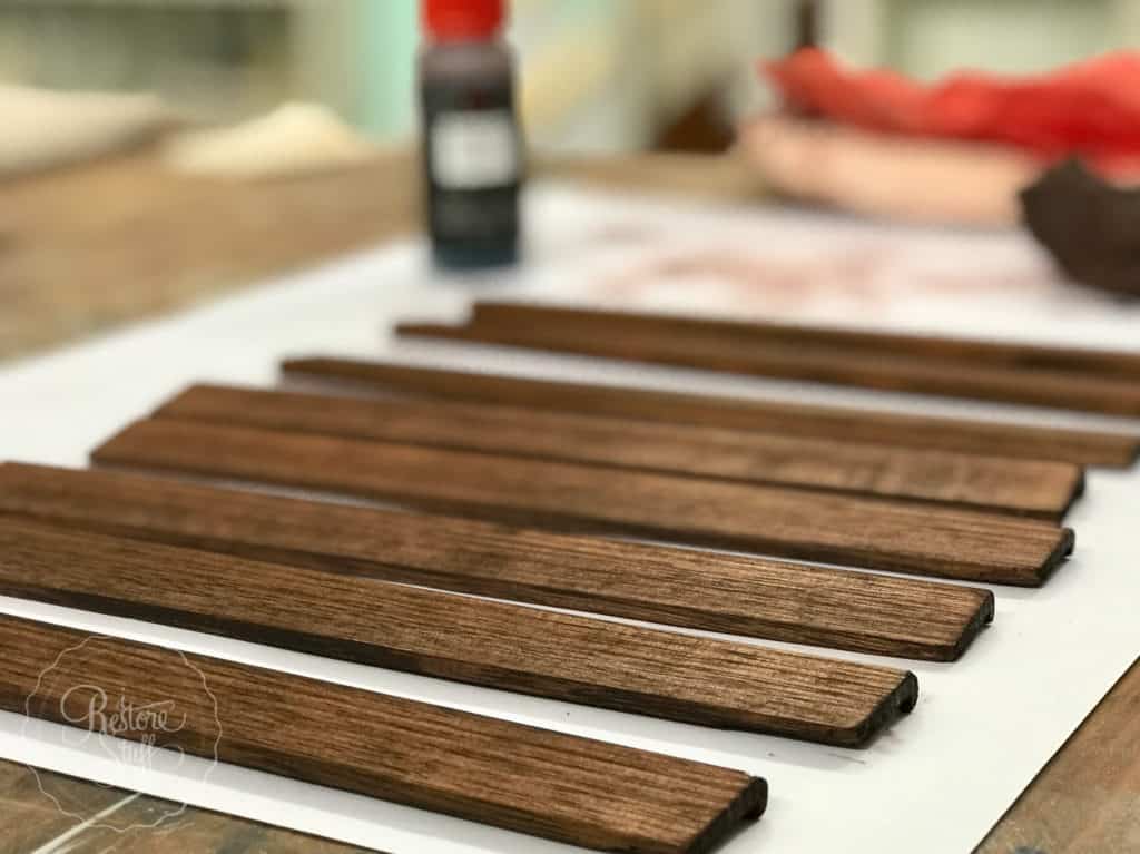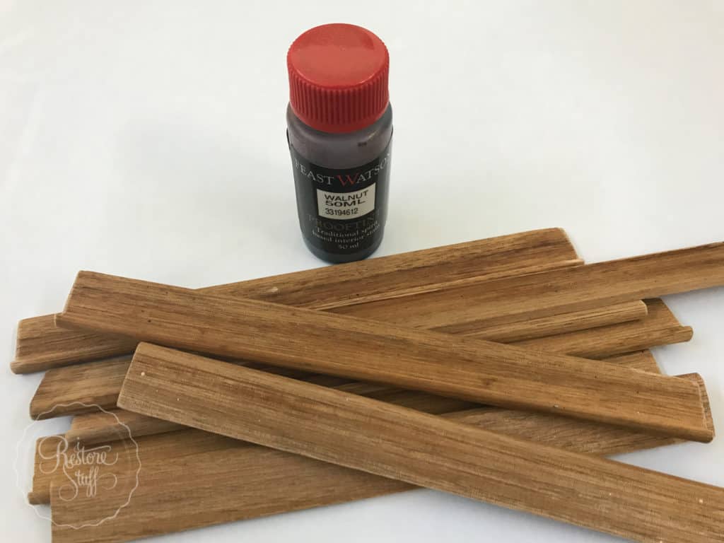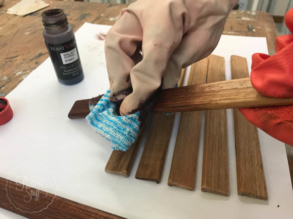After cutting all the pieces to size, I grabbed some Walnut stain I had on hand and stained each piece. UPDATE: You could use our Fusion SFO in Walnut for this. Don’t forget to use GLOVES!