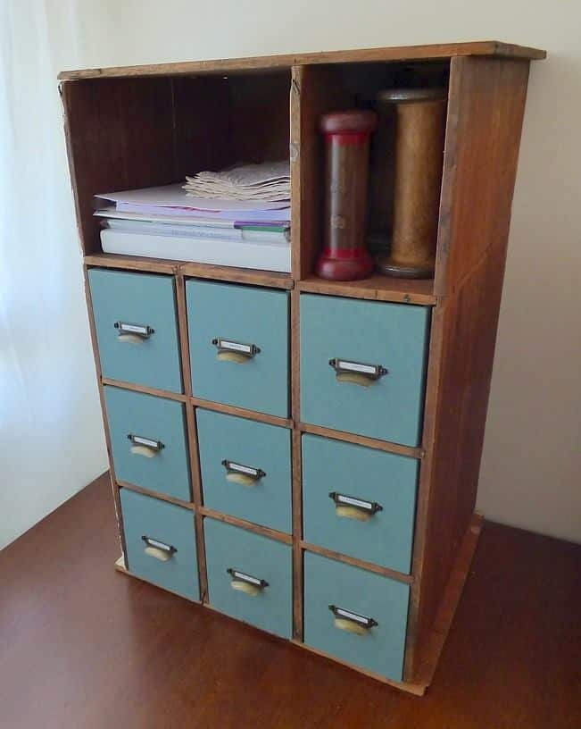 Don’t you love this finished look? I love how she kept the original wood and just painted the new drawers. Such a lovely way to make the pigeon hole cubby all tidy!