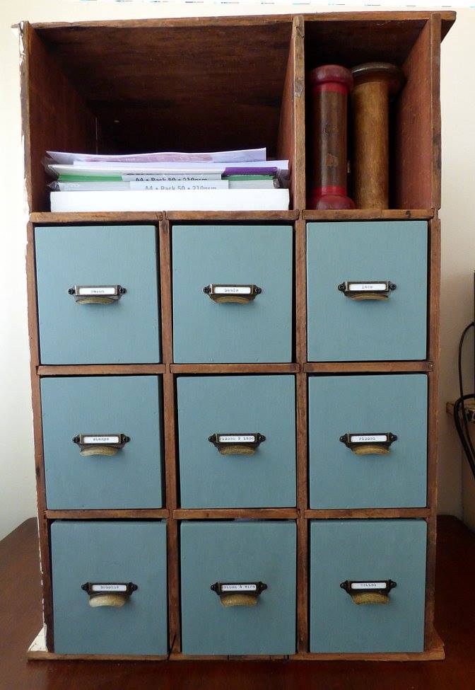 Evonne says, “I had bought these old pigeon holes ages ago in the hope that it might help better organise some of the little bits around my craft room (and I just love old pigeon holes ) But sadly, they weren’t as helpful as I’d hoped, as I kept losing things in them and it’s hard to see what’s up the back. So I asked hubby to make me some simple drawers for them.”