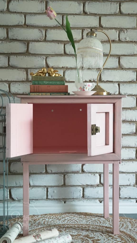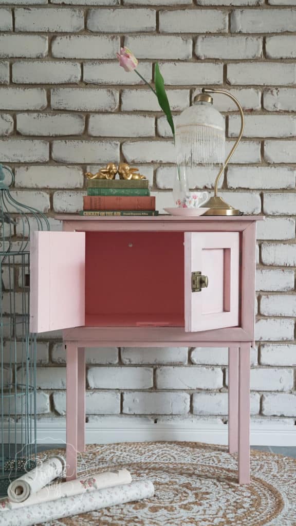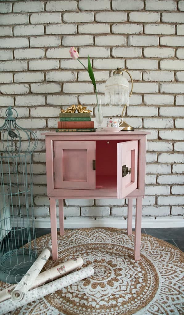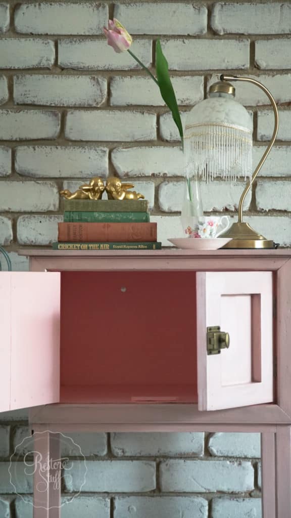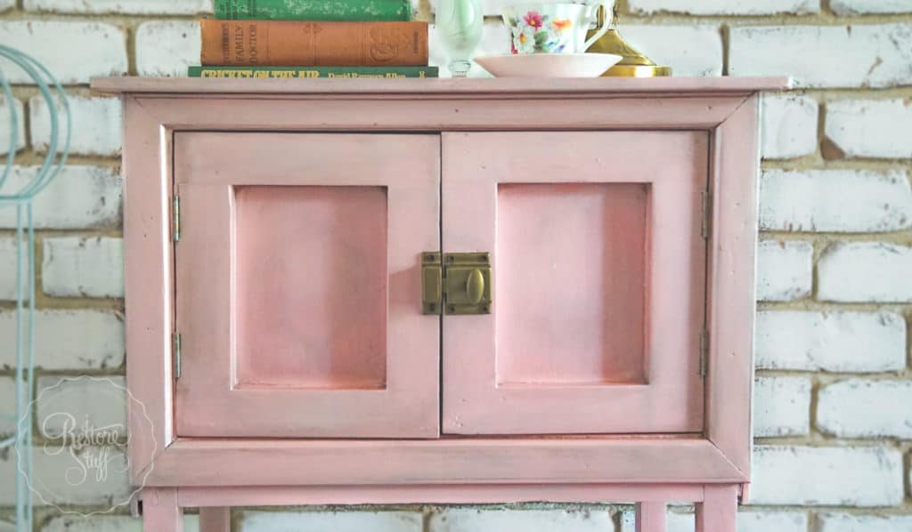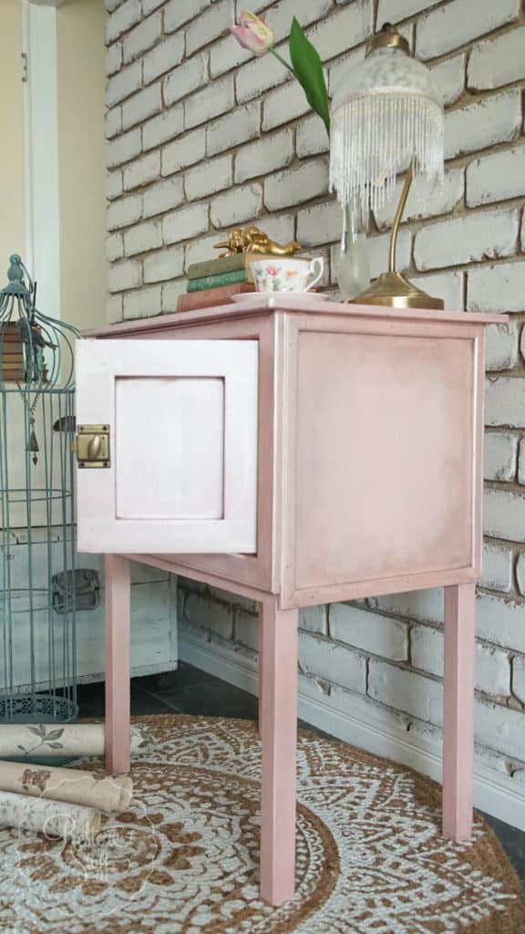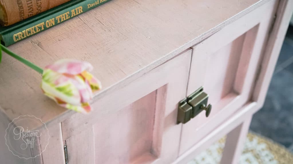 Here’s the deal: the top of this cupboard was pretty ratty! I mean it was stripped of what was probably a veneer top, we puttied up a gouge in the top and so, I wasn’t sure that the pretty pink matched the rugged rustic appearance of this chippy little piece. I was beginning to think I should have left it chippy and shabby as my sister-in-law had suggested to me in the first place. But I was committed now – the pink was on – so now I needed to add a little punk to the pink.