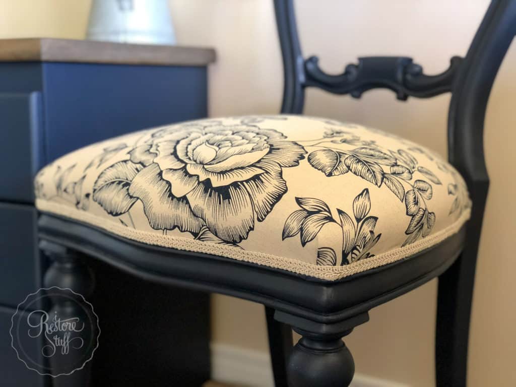 I also happened to have enough of the same linen colour gimp braid in my upholstery stash to complete the trim on the chair edge! I love it when I don’t have to run out for supplies in the middle of a project!