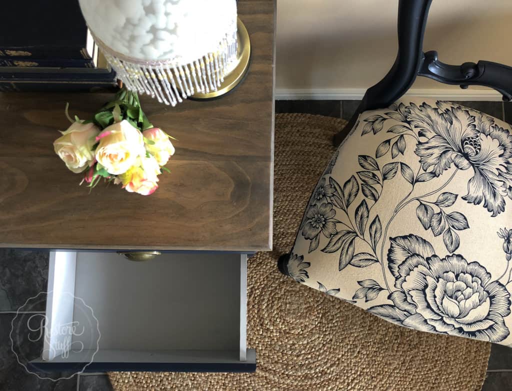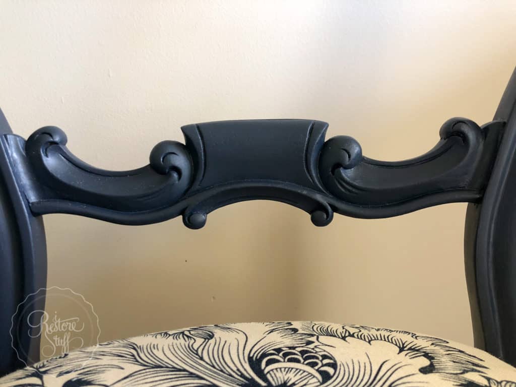 Note how the chair is darker than the bedside seems to be? Same Midnight Blue from the same jar. Only explanation I can think of is the difference in the base colour that I painted over. The balloon back chair was a dark wood, and the bedside drawers were the Brushed Steel, so that silvery metallic underneath may have made the slight difference in having a lighter shade.