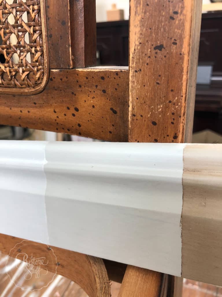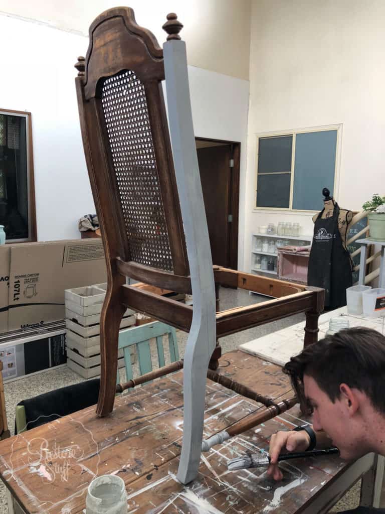 It’s a great idea to give your furniture a light scuff sand before painting with Miss Mustard Seed’s Milk Paint. These had an existing varnish that was quite old and sanded back well.Rattan back chairs