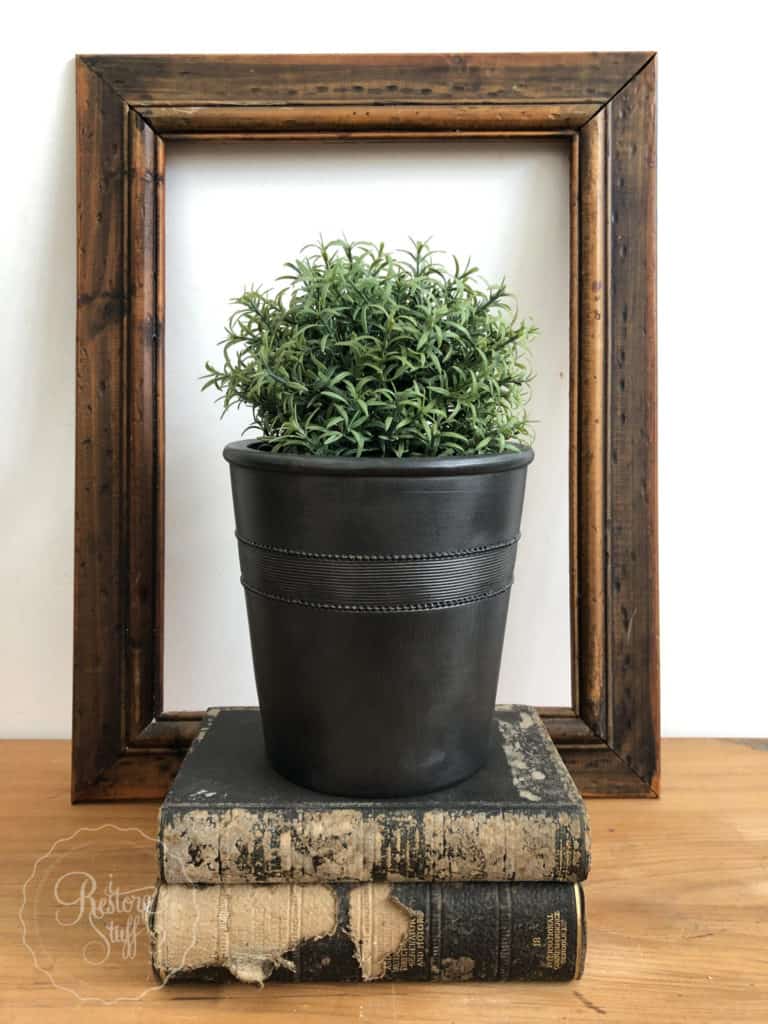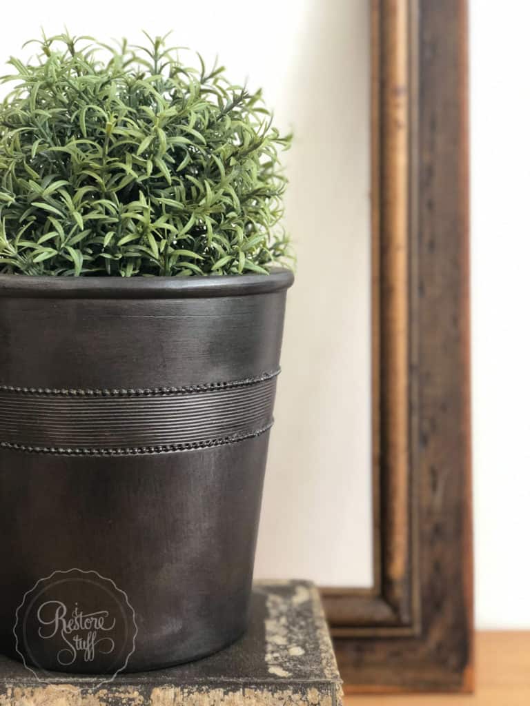 For this easy makeover, I used Fusion’s Coal Black to paint the entire pot, then finished with Miss Mustard Seed’s Zinc Wax to give it a metallic, kind of gun metal finish. I love how it turned out: