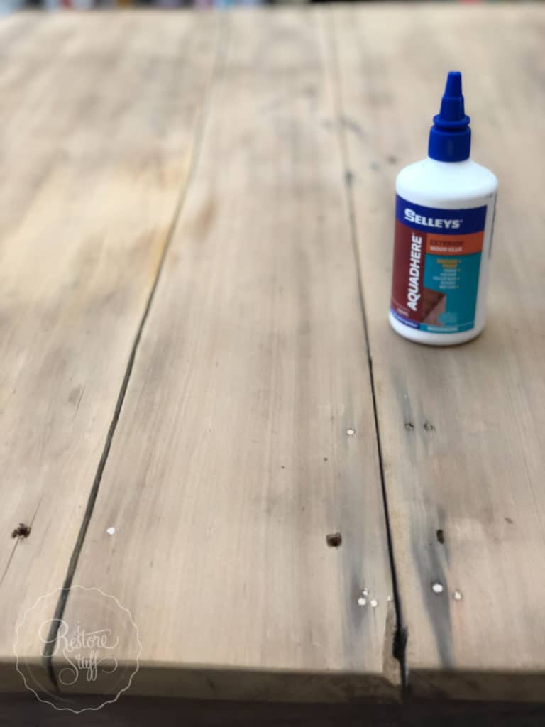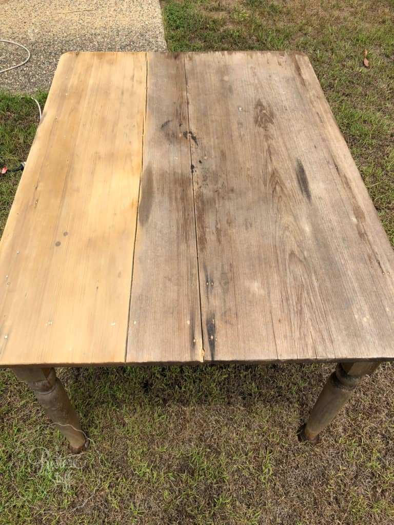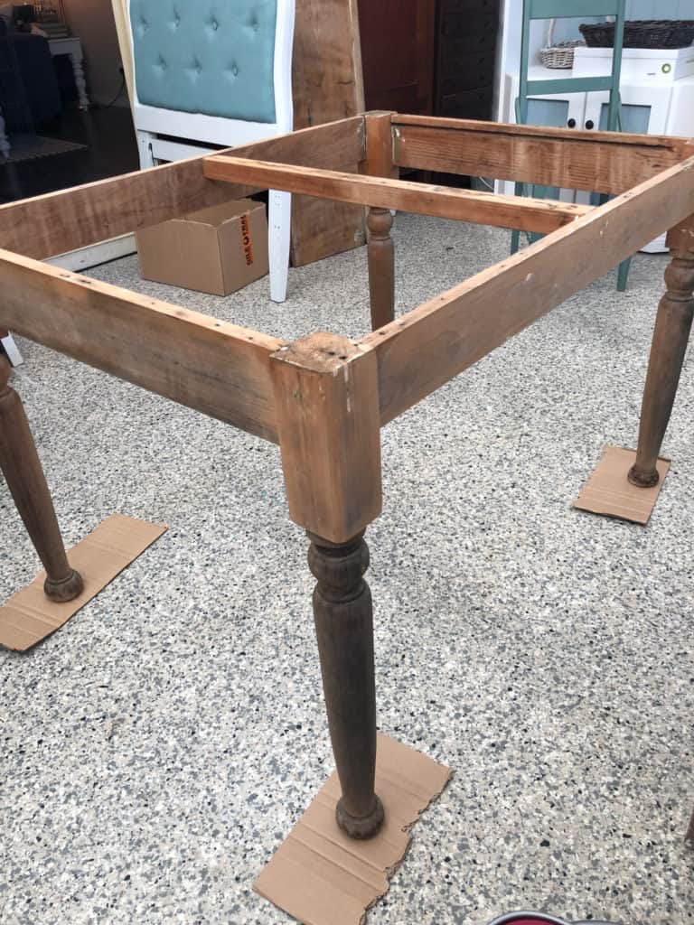 I scrubbed and sanded the table. The top was a little warped and was already split in one section.