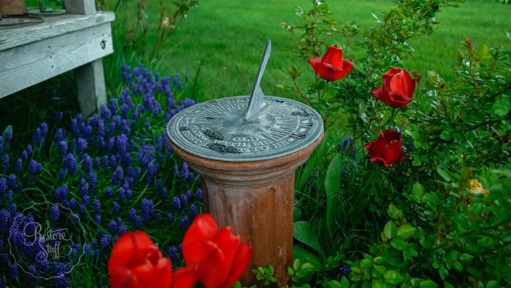 This old sundial sits in the back garden among the pretty flowers.