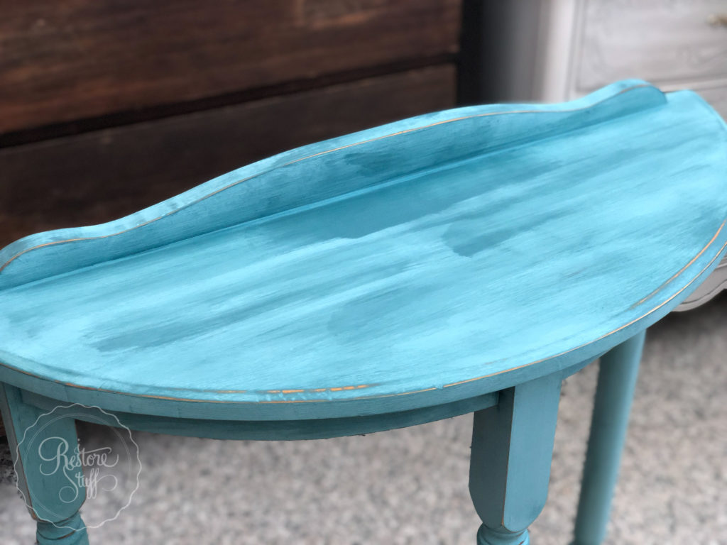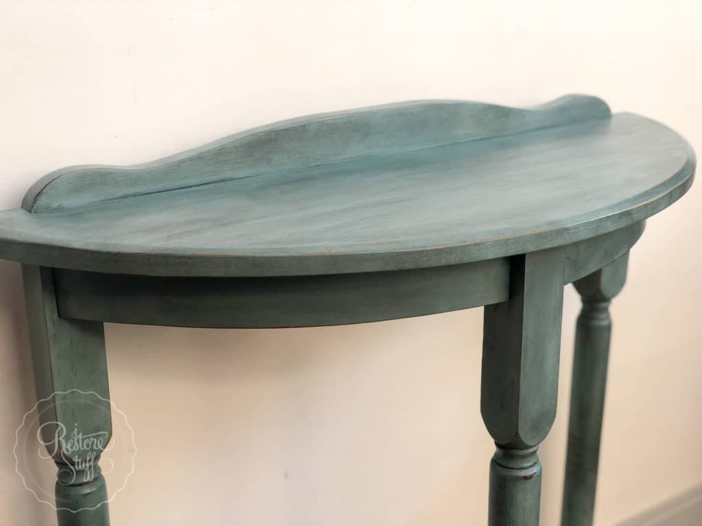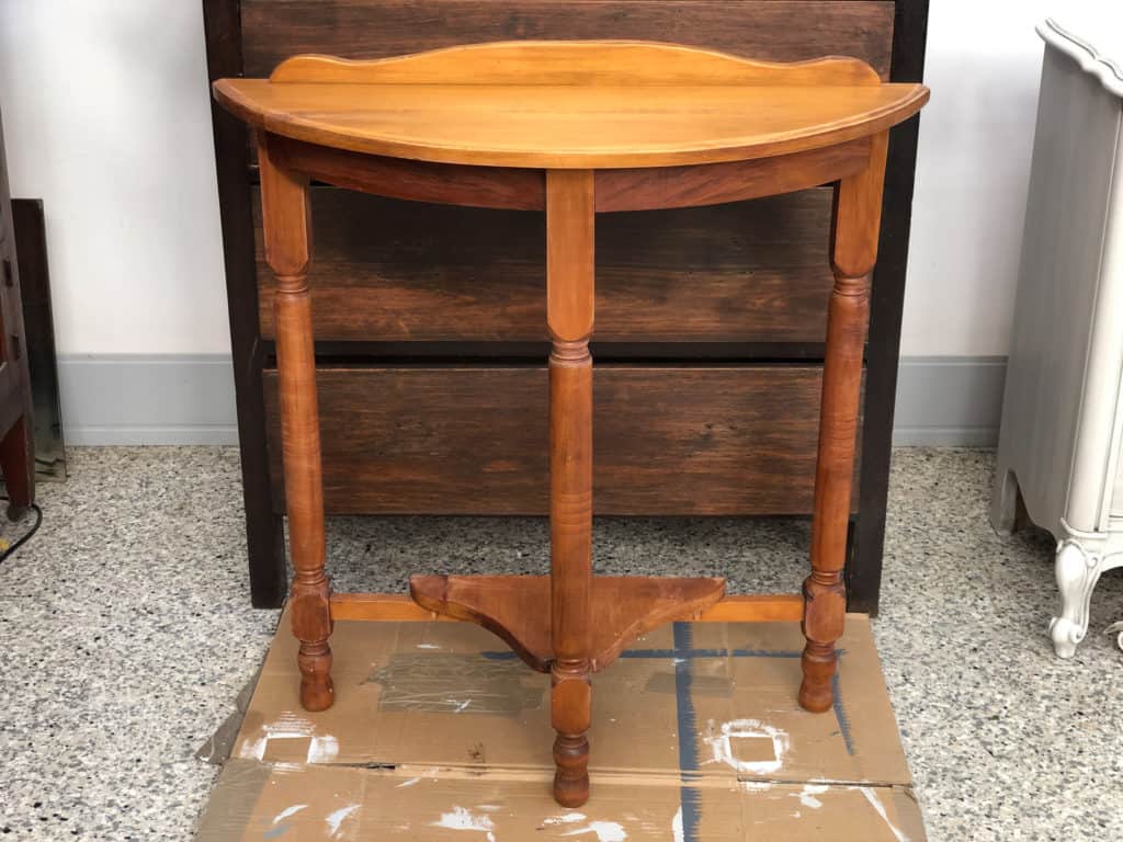 I started with this demilune table, a golden colour, with a varnished finish. To prep this piece, I sanded using a 180 grit on my Sanding Glove and gave it a scuff sand all over. This takes only a few minutes – no need to sand right back to raw wood. You are only scuffing the surface for better adhesion of any paint. Wipe down with a damp cloth and you are good to go.