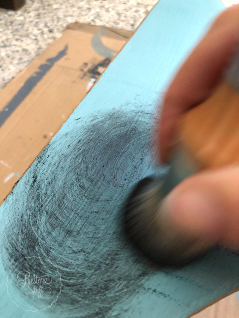 Now, generally, when waxing over Chalk type paints, because the surface is quite porous, I find it easier to first apply a clear wax before applying the darker wax or white wax. This allows the black or dark wax to be a little more forgiving and “moveable” across the surface of the clear wax. It also allows it to be “removed” more easily in areas where you want less dark wax, after it has been applied.