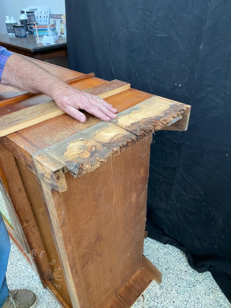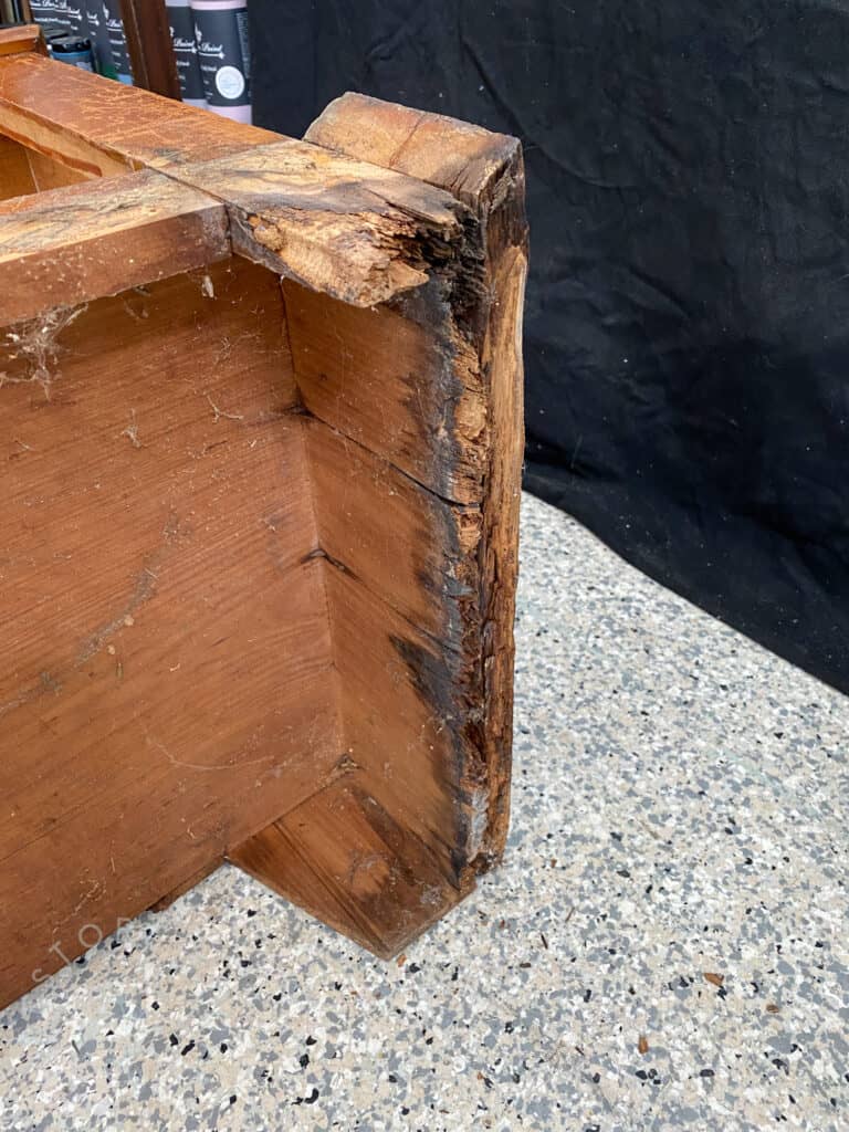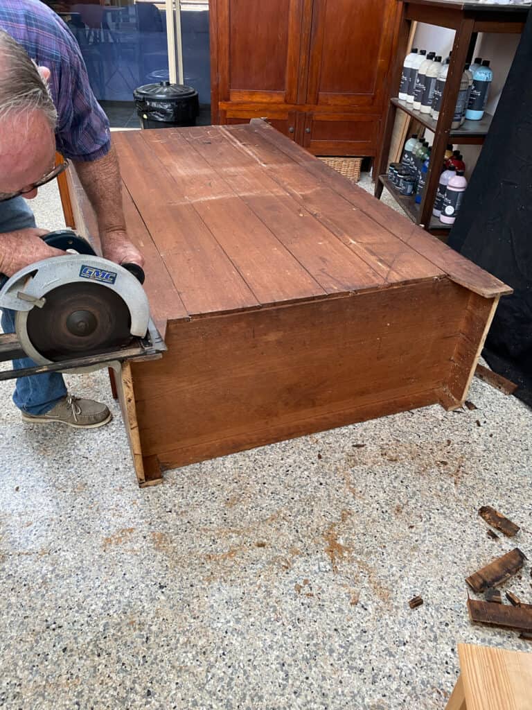 The whole base was water damaged and had rotted, so we lay this big guy down and assessed the damage. We removed the front panel of the base skirting and decided to trim off the damaged portion.