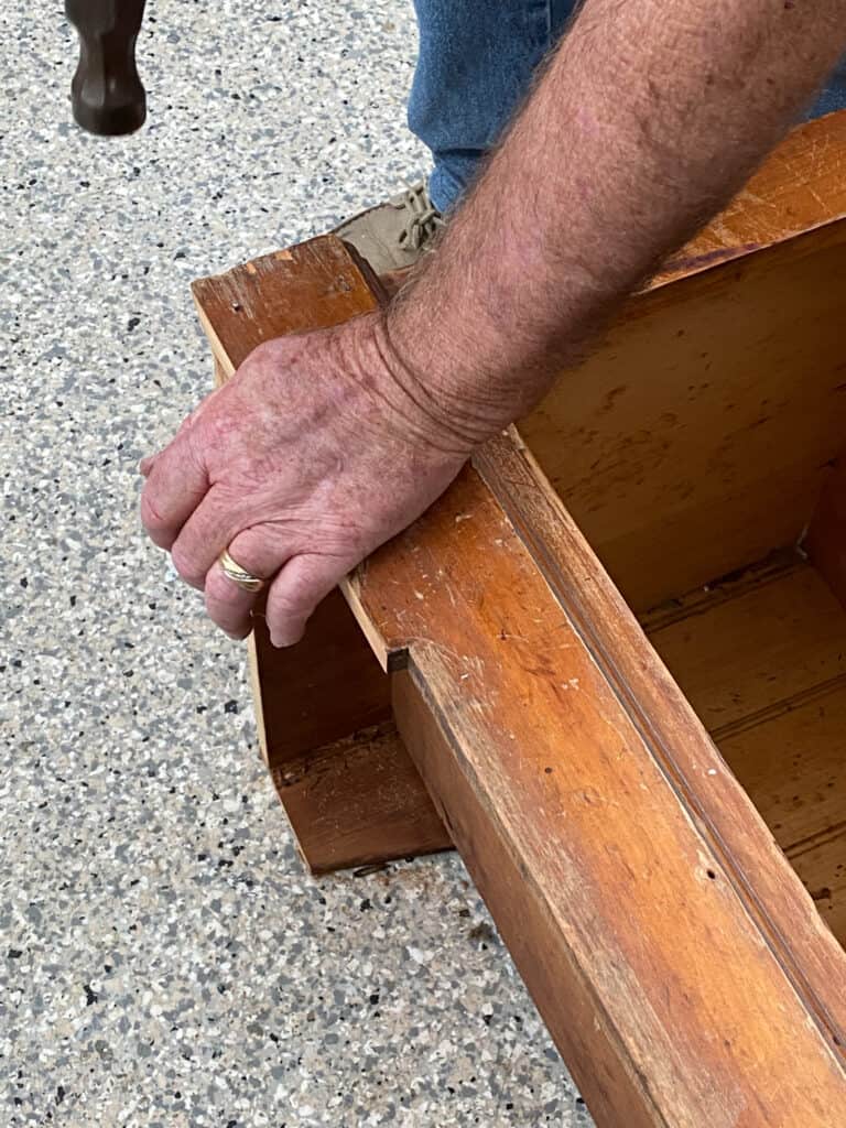 Here’s the big drawer which I applied white wax to, to give it a lighter wash look. Then added the cup pull handles on. I love the little dings and crevices that hold the white wax.