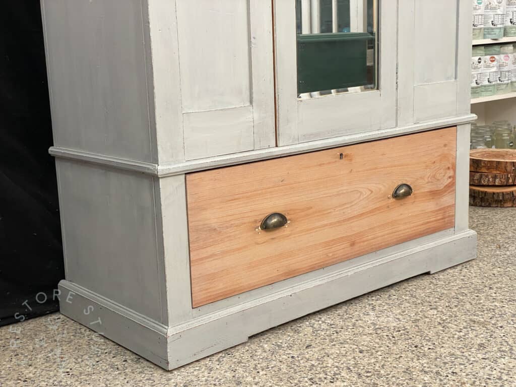 I like the look of having some bare wood on some pieces, whether it be the top of a dresser or the drawers of a piece. So I sanded back the big bottom drawer to reveal some lovely timber underneath. I’ll show you the lovely wood further down this post.