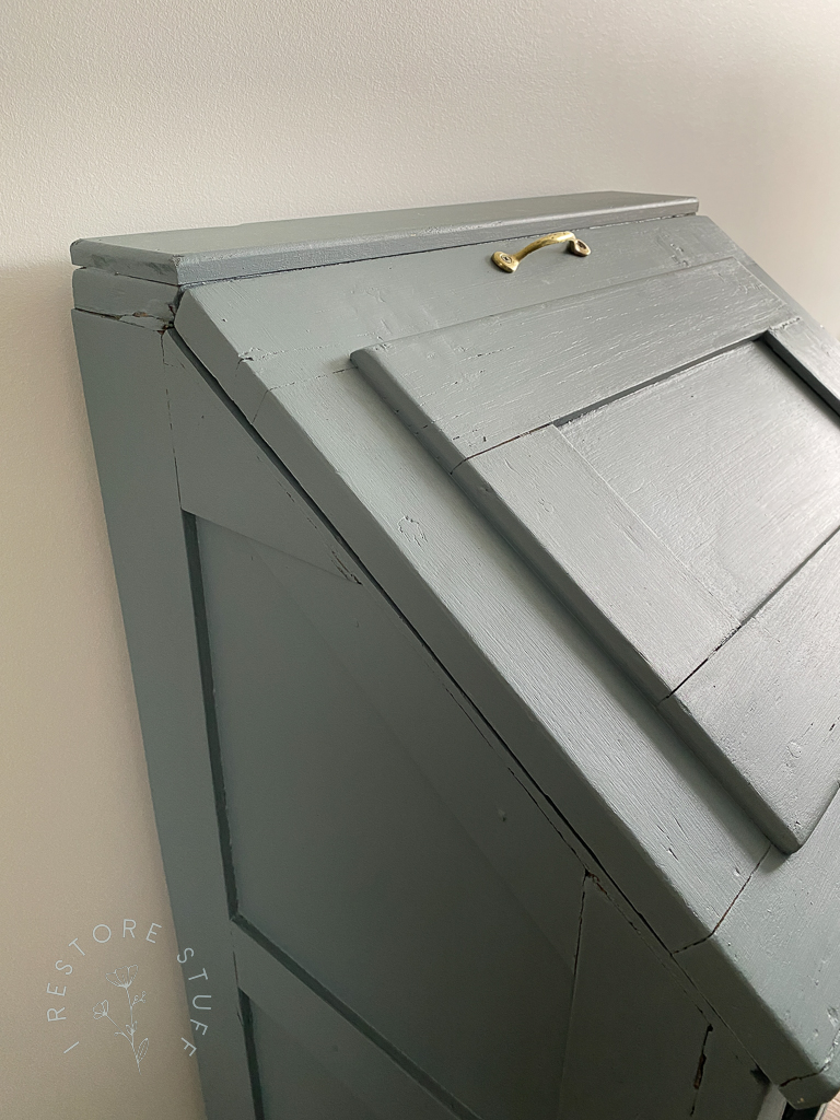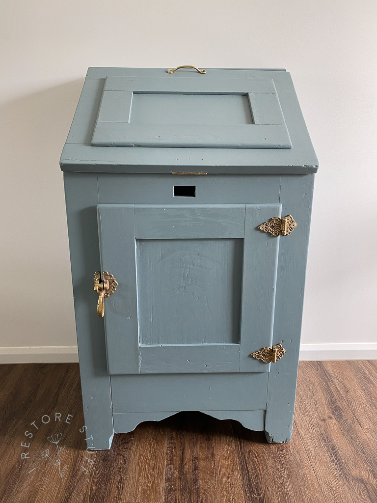 After painting inside and out in the colours listed above, I attached all the original hardware on again and here is the finished look.