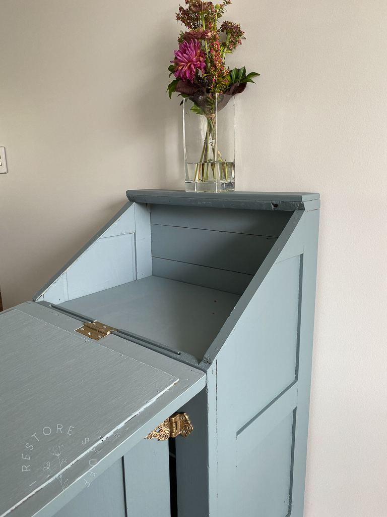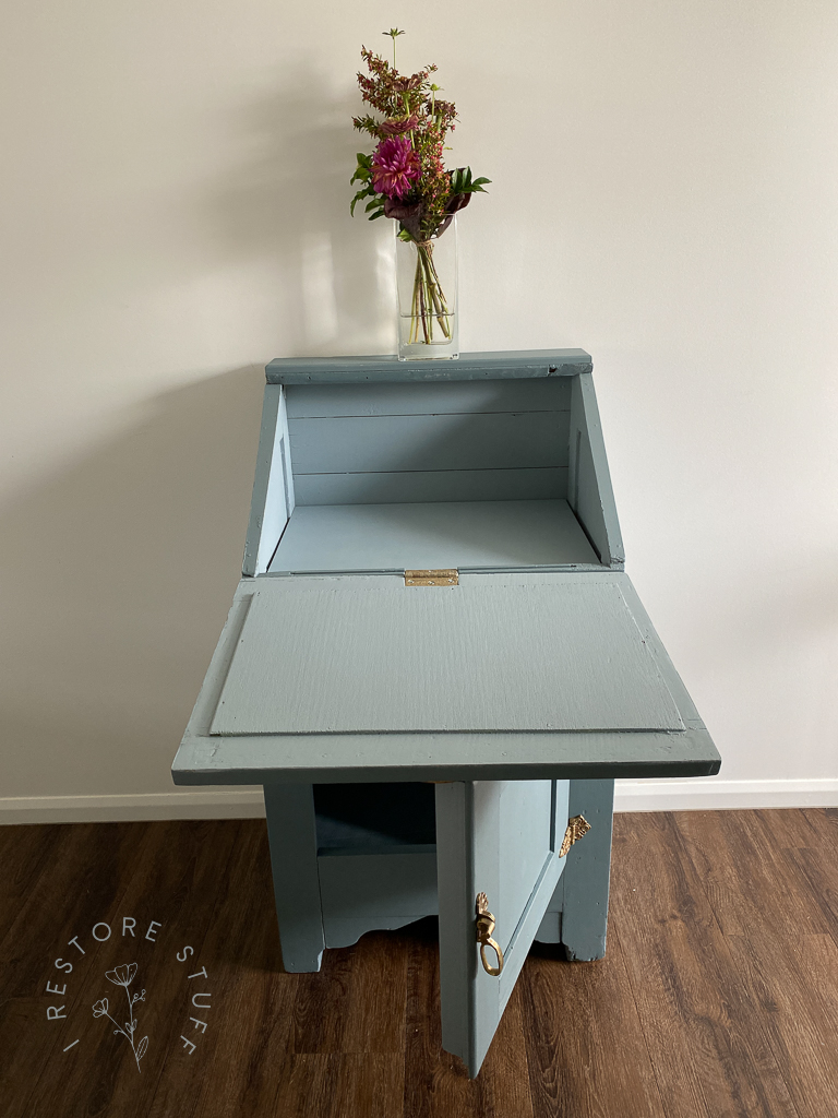 While I was trying to decide how to do it up, I knew it would have to be repainted, as the basic framework was put together with various types of timber and layers of paint. This would not work well as a “restored” finish with any type of stain work. My daughter was looking for a small cupboard that she could use for her garden tools and potting bits and pieces, so I showed her this, and she picked some colours from our Fusion Mineral paint range.