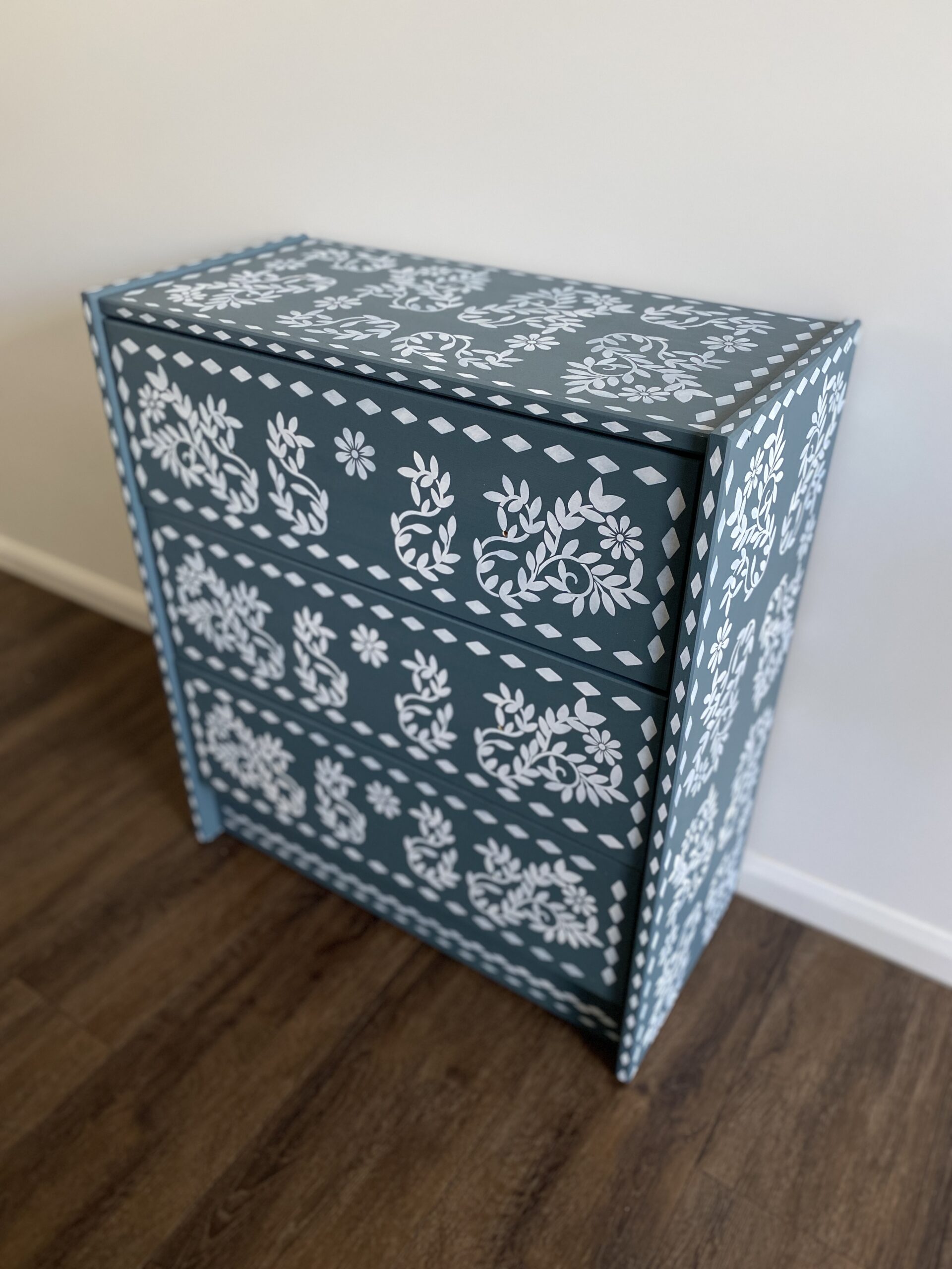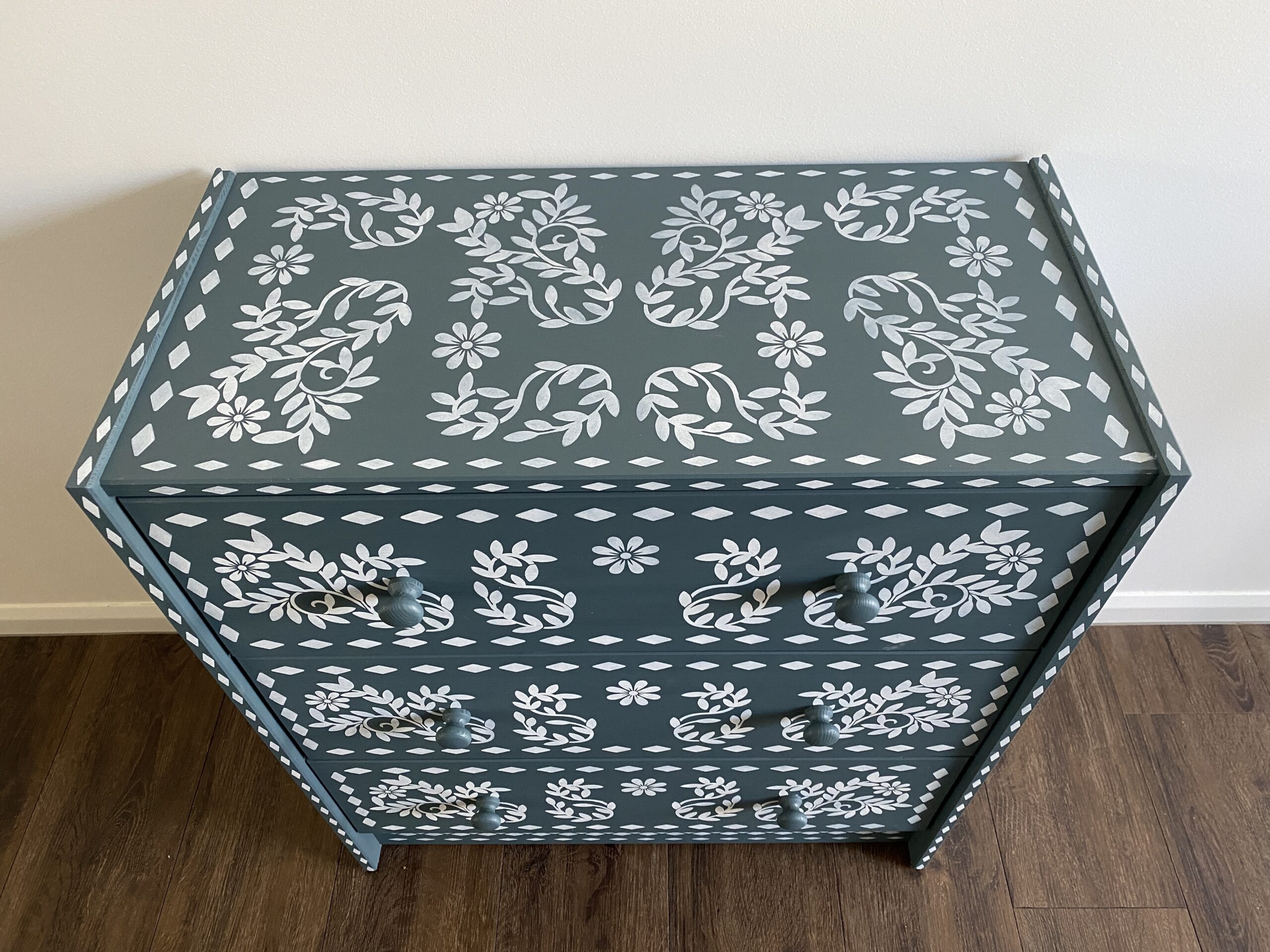 I was excited for the opportunity to collaborate with Essential Stencil on this collection and one of the big projects I worked on while creating this set, was using the Bone Inlay Pattern Stencil on this ordinary IKEA chest of drawers.