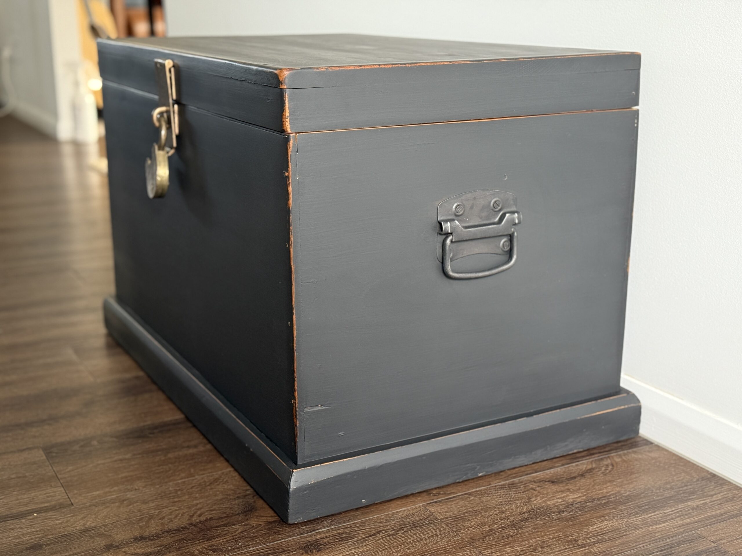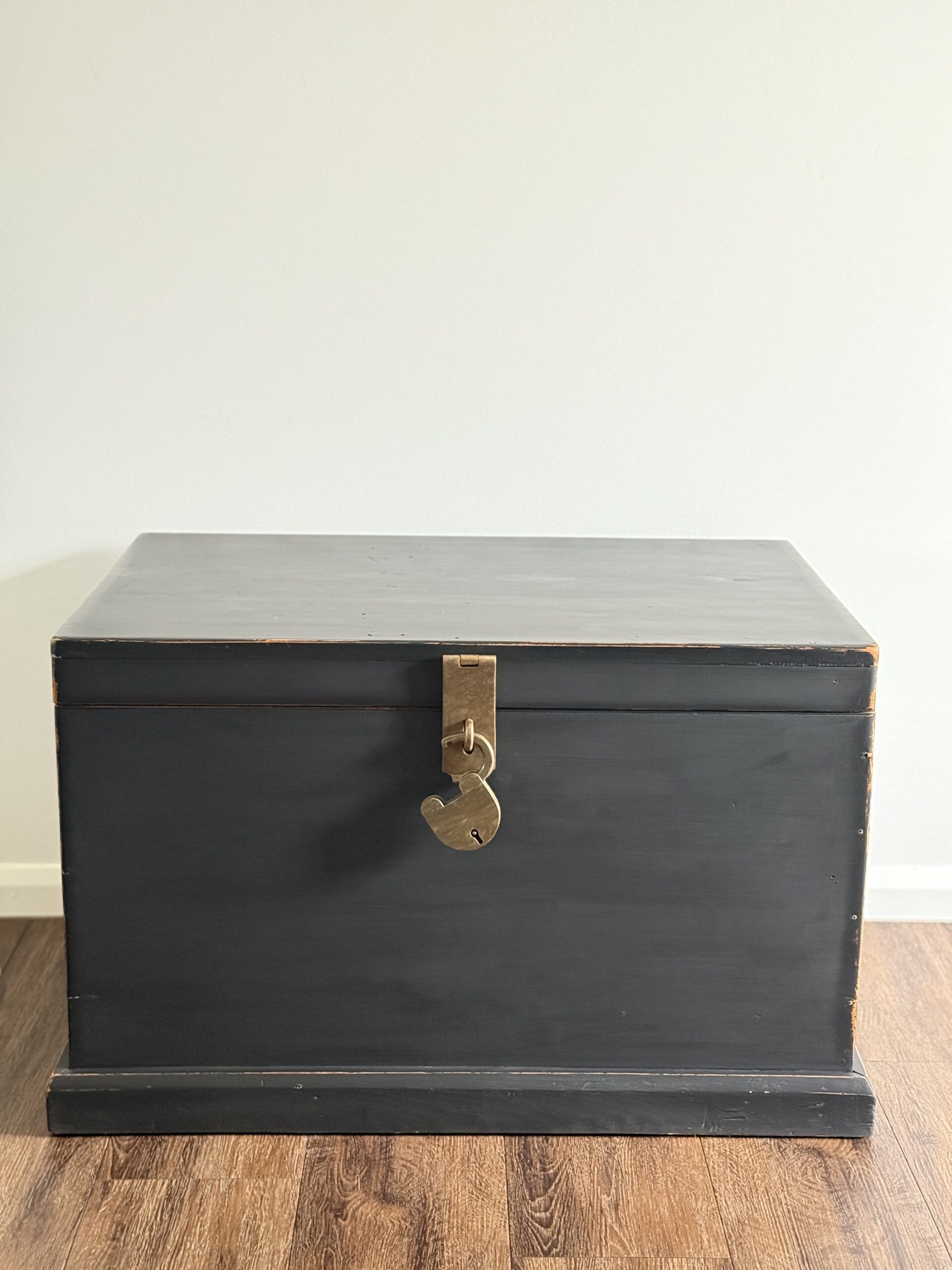 My client delivered her blanket box & asked me to replicate a finish I had done on her dining setting many years ago. Back then I was a retailer for Miss Mustard Seed’s Milk Paint here in Australia, and I had used the colour, Typewriter,on the dining setting, along with distressed edges where the wood would peek through.